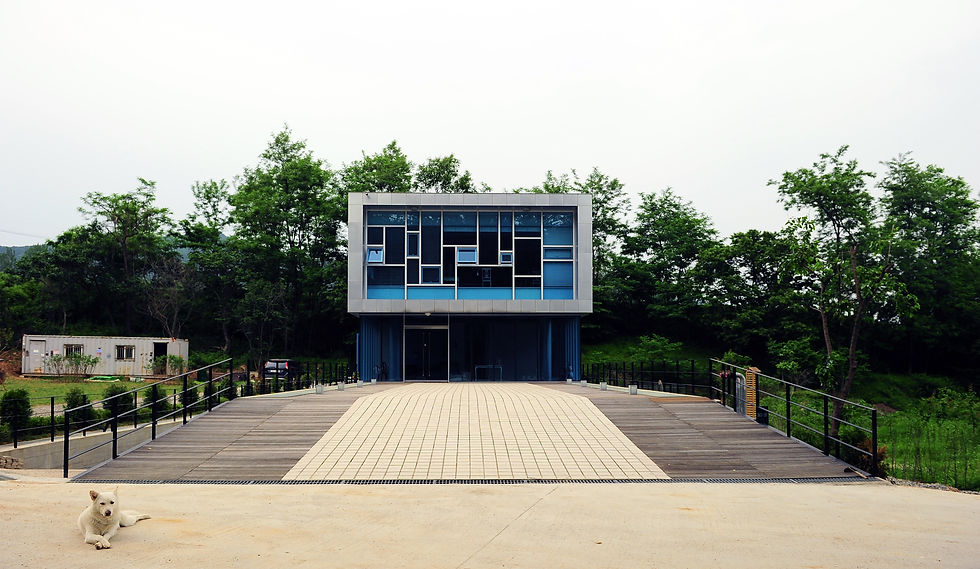 This project was commissioned by a retiring sculptor who taught in a National college in Korea. The site is sitting behind a couple of buildings and the front street which is surrounding a beautiful lake, and is surrounded by small hills at the other three sides as protected (or visually disturbed.)